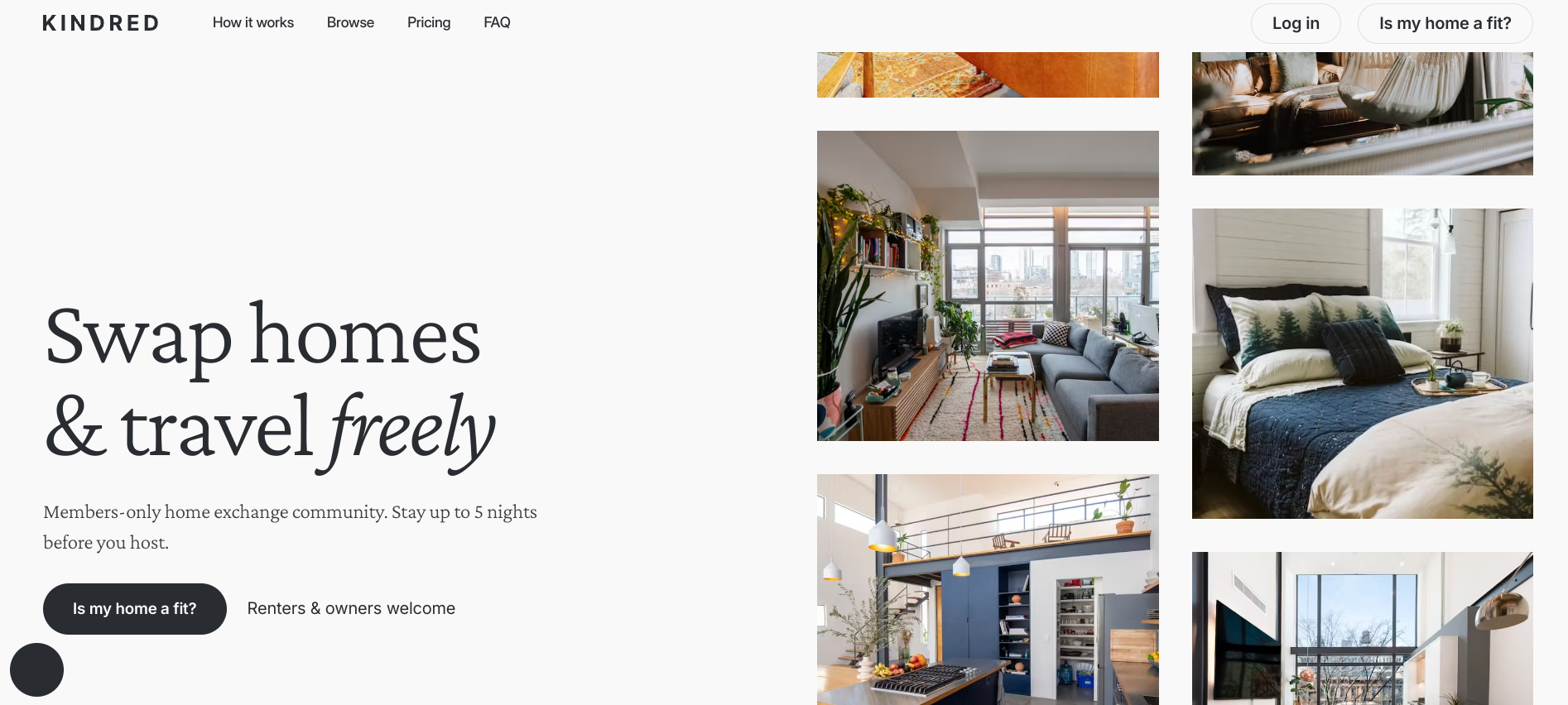 Application process: You’ll need to apply for membership and verify your identify; only homes that meet Kindred’s Property Requirements will be considered. If you’re accepted, you’ll get an onboarding call and access to a members-only Slack channel.